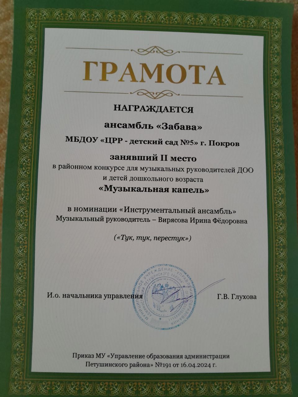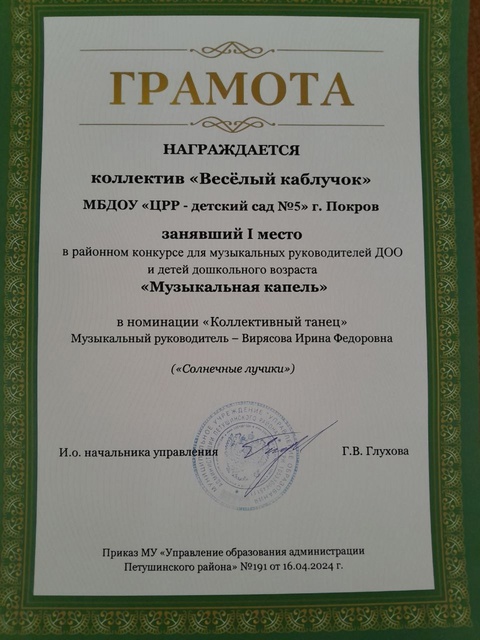 В апреле этого года проводился районный конкурс для музыкальных руководителей и детей дошкольного возраста "Музыкальная капель". В номинации "Коллективный танец" наш музыкальный руководитель Вирясова Ирина Фёдоровна и дети старшей группы воспитателя Клячиной Натальи Александровны с танцевальной композицией "Солнечные Лучики" стали ПОБЕДИТЕЛЯМИ!!! А дети подготовительной группы с музыкальным руководителем Вирясовой Ириной Фёдоровной и воспитателем Стешечкиной Светланой Евгеньевной заняли второе призовое место!