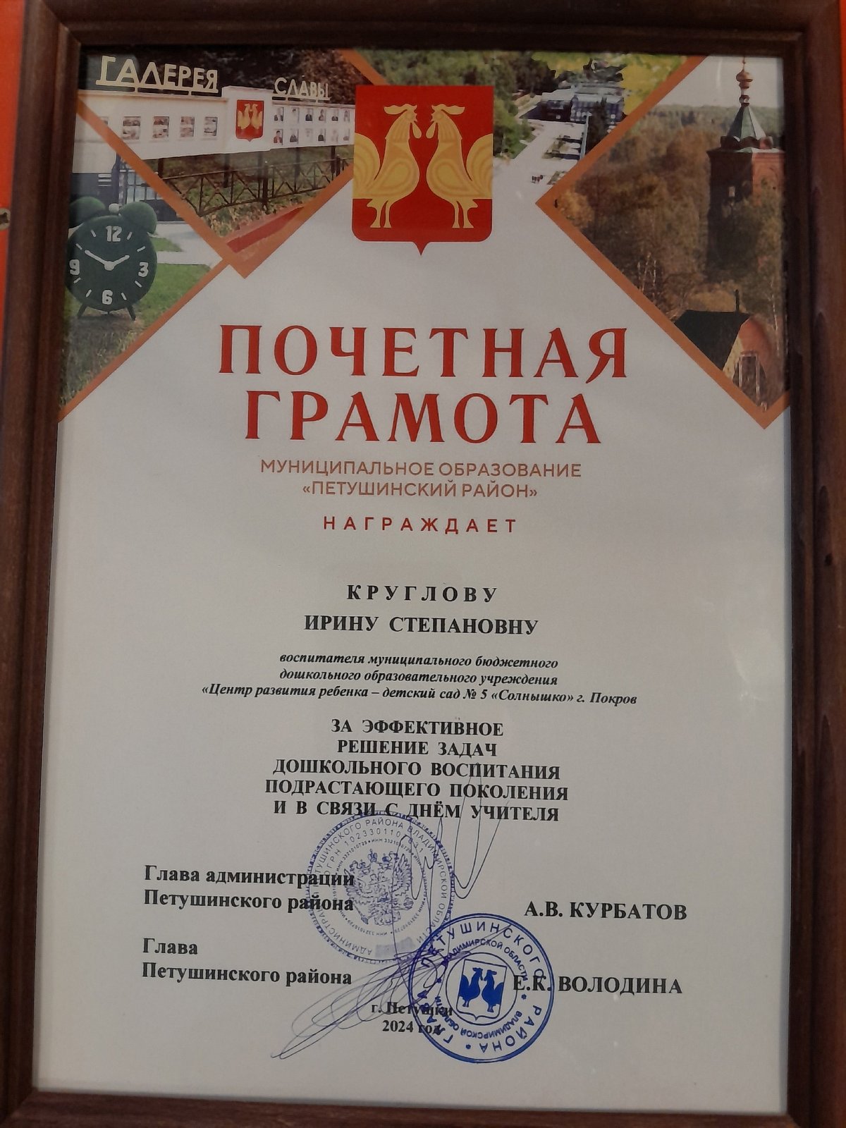 Воспитателя Круглову Ирину Степановну с награждением Почётной грамотой муниципального образования "Петушинский район"!